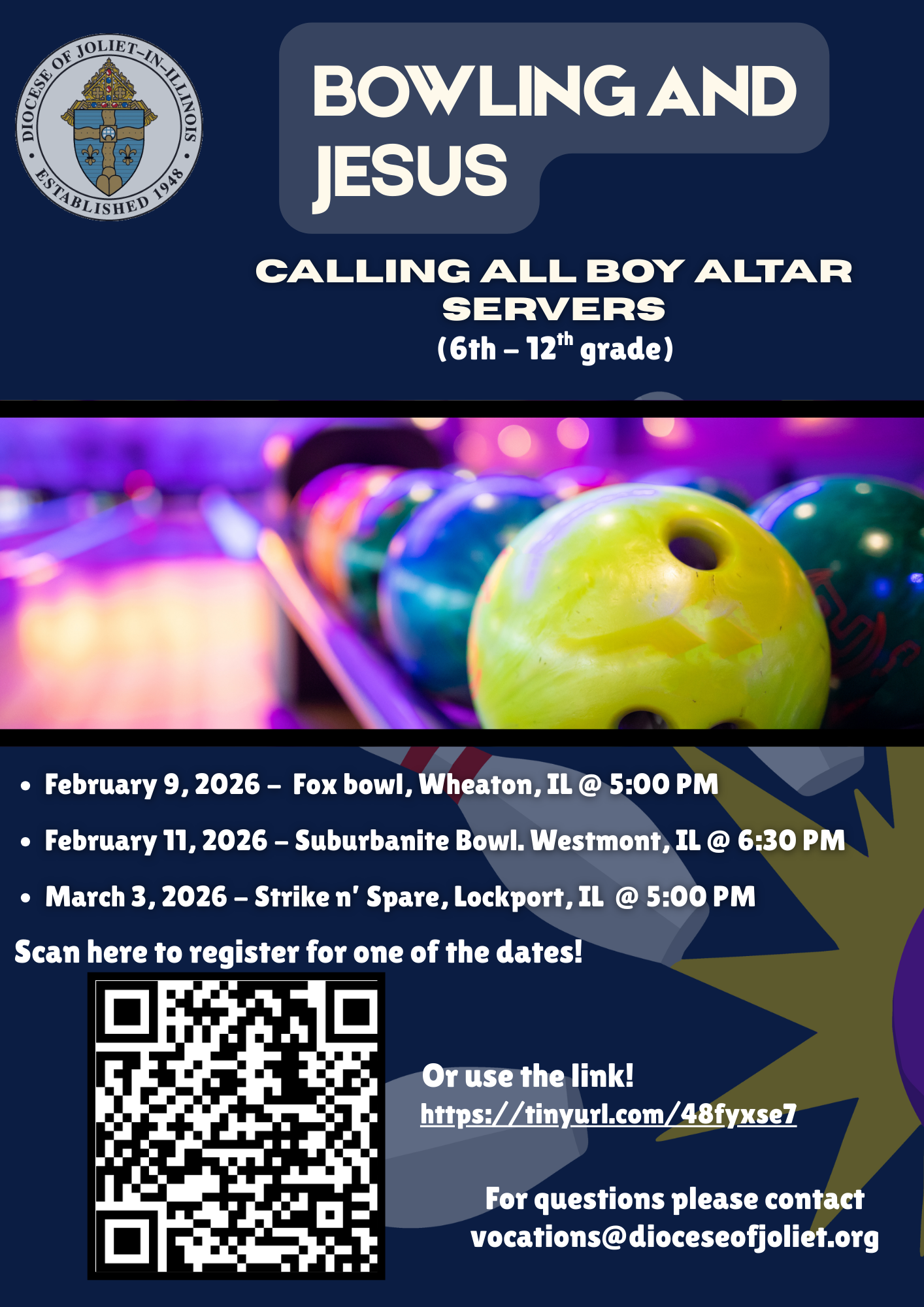 Join Father Steven Borello for an evening of bowling. This event is for boy altar servers 7th grade and older. There are 3 opportunities for Bowling and Jesus. Sign up now for the event closest to you!